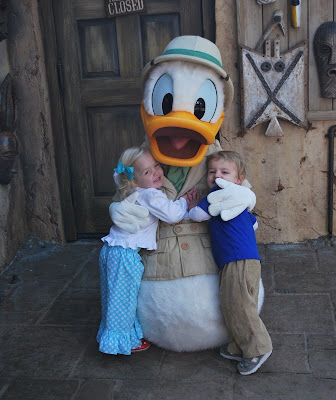 On Friday we had to be at the Animal Kingdom for a character breakfast. We had breakfast reservations at 10:15 at Tusker House, which turned out to be one of my greatest moves of the trip. It was the last breakfast seating of the morning and the characters are only there for breakfast, so we got LOTS of one on one time with all the characters, which the kids loved. Each time they see Mickey, Minnie, Goofy, etc., it's as if it's the first time. I don't think they would ever get tired of hanging out with them! On the way to our breakfast we ran into the Jungle Book characters (not sure of their names). The gorilla LOVED Reese. He would not let her go, and when she would escape he would chase after her. It was so funny and cute! We also got to see the Tree of Life (beautiful), ride the choo choo train, and go on an African safari! The kiddos were both pooped by the end of the day and took a VERY good, long nap in the stroller. By day 5, we could tell they were almost completely worn out.....too much fun!!
